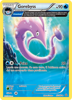 Oggi vi presentiamo Gorebyss. Questo Pokémon, il numero 368 del Pokédex, si evolve da Clamperl ed é stato stampato in pochi set come, per citarne alcuni, Rivali Predestinati, Colpo Fusione o Scontro Primordiale. La carta in foto é una Alternative Art anno 2015 vintage di Scontro Primordiale e rappresenta un Gorebyss con espressione visibilmente ansiosa.